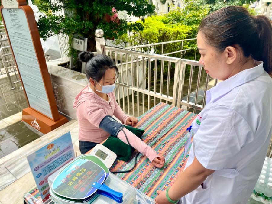 活动现场,吸引了许多游客、景区服务人员前来问诊,义诊团队热情地为大家提供免费的血压、血糖测量服务、针对健康方面解疑答惑并免费发放矿泉水、扇子等,用于缓解酷热给大家带来的不适感。