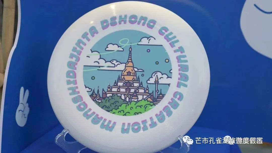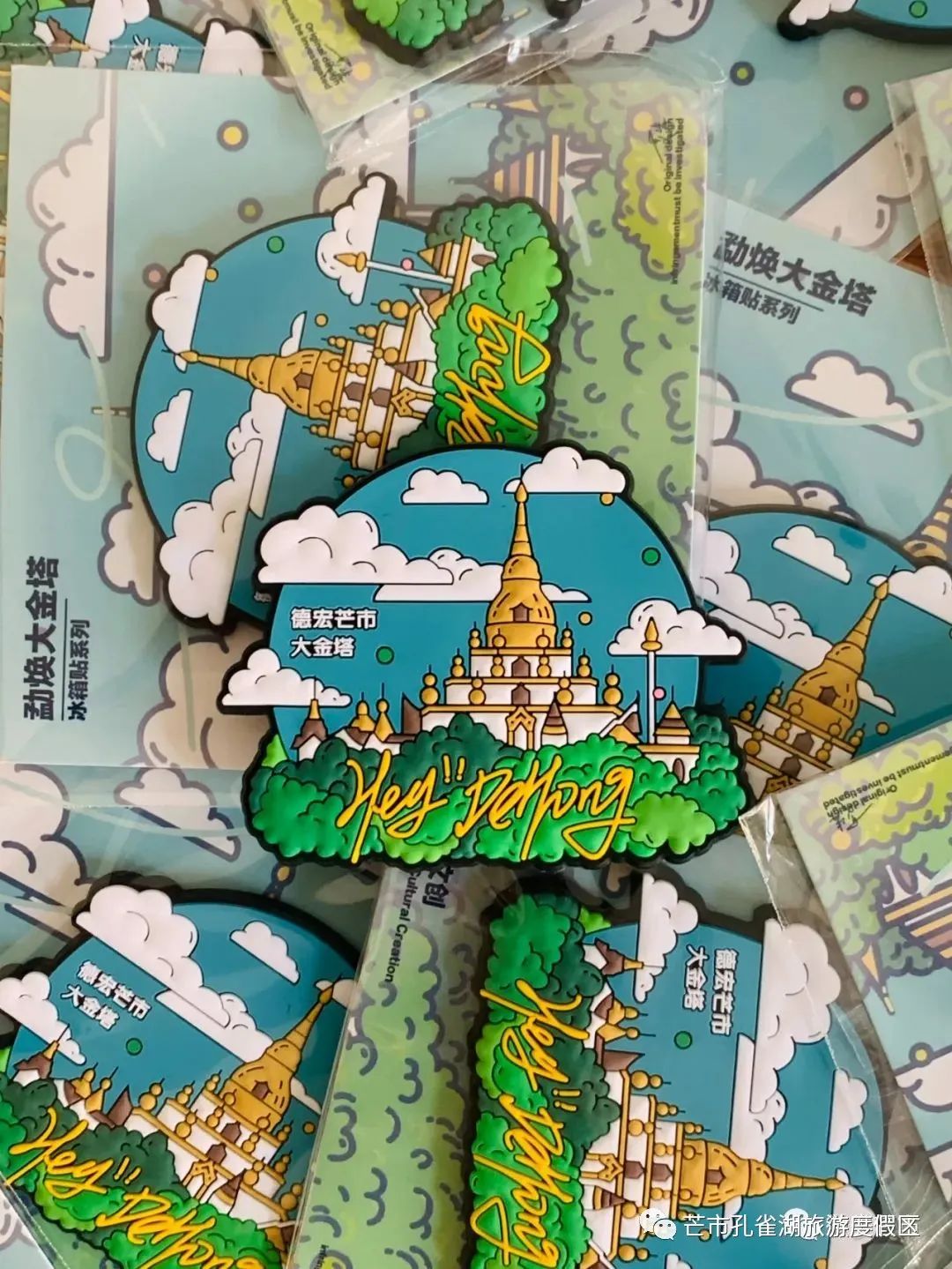 将勐焕大金塔、棕榈大道、景颇族目瑙示栋等特色插画,运用在飞盘、钥匙扣、扩香片、小相框、明信片上,展示了芒市独特而多彩的文化风貌。